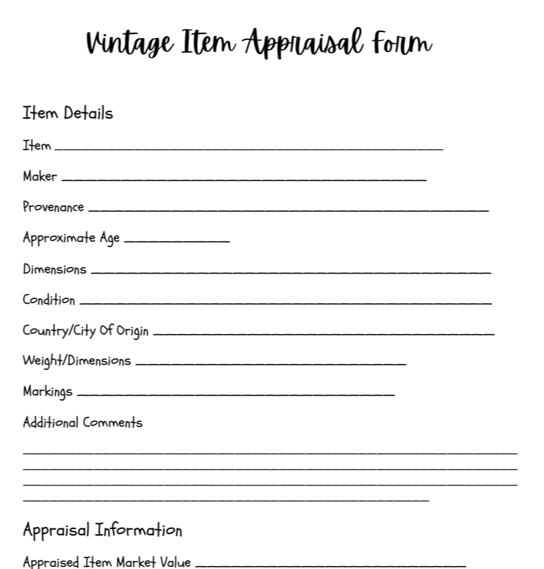 A Vintage Item Appraisal Form can unlock higher resale value when selling antiques. Check out our downloadable Vintage Item Appraisal Form. This form covers antique appraisal basics when offering appraisals when determining resale market value on antiques and collectibles. Click on the form to the right to download.