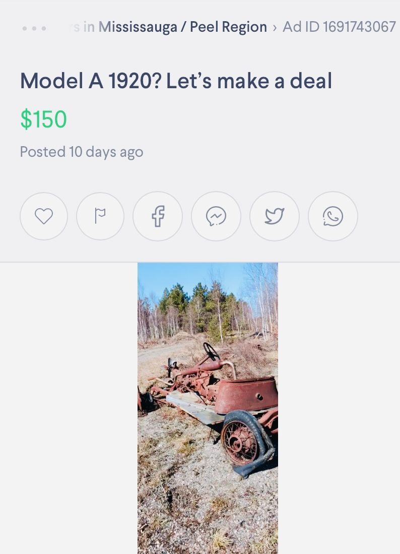 When looking for an old car to restore some good advice I received was to look for something with as little rust as possible. Body work such as painting, sanding, and replacing is specialty work that is not easy to do on your own. Below is a recent ad posted on Kijiji for a Ford Model A.